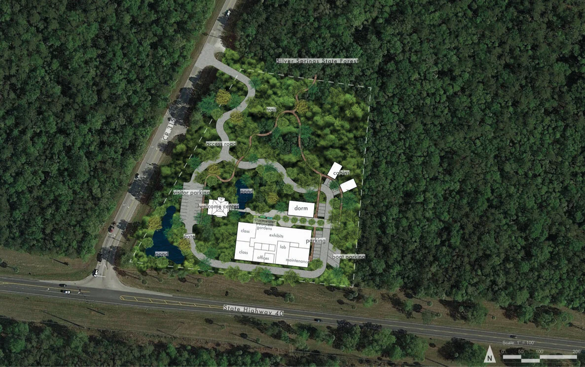 This proposal is for the Florida Springs Institute’s initiative to build a Freshwater Research and Learning Center at Silver Springs State Park. The Center is comprised of an exhibition space, classrooms, a laboratory, and dormitories. The landscape design demonstrates best water management techniques and the beauty of spring flora, arranging elements to create a campus feel to the site. A runnel in the central plaza conveys water from paved areas into a series of stormwater treatment gardens. After the water is treated, it flows into a landscaped pond with a bridge and scenic overlook
